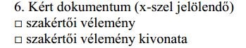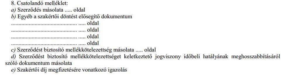 Amennyiben kizárólag mellékkötelezettség érvényesítésével kapcsolatban nyújtják be a kérelmet, úgy a szakértői vélemény kivonatát, egyéb esetben a szakértői véleményt (vagy mindkettőt) kell megjelölni.